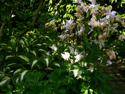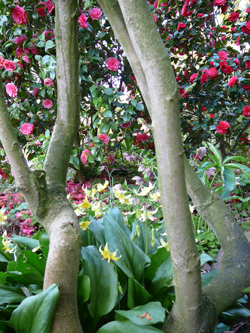 Hier sehen Sie gegenüber der weißen Silver Anniversary einen mit zart gelb/roten Glöckchen blühenden Enkianthus. Über der Silver Anniversary beginnt eine Scheinkamelie (Stewartia) mit dem Laubaustrieb. Sie wird ihre kamelienähnlichen Blüten öffnen, wenn die Pracht der Kamelien vorbei ist.